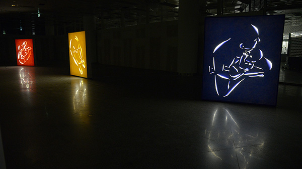 Zranené plátno 1 - 3, 2019, svetelné objekty, LED svetlá, akryl na plátne, vystrihované, každý objekt 180 x 150 cm, Východoslovenská galéria Košice, festival Biela noc 2019, foto: Dorota Sadovská