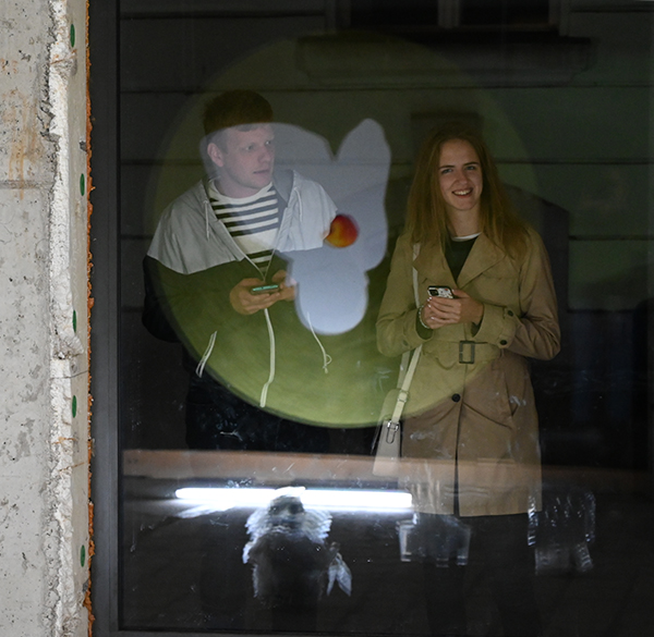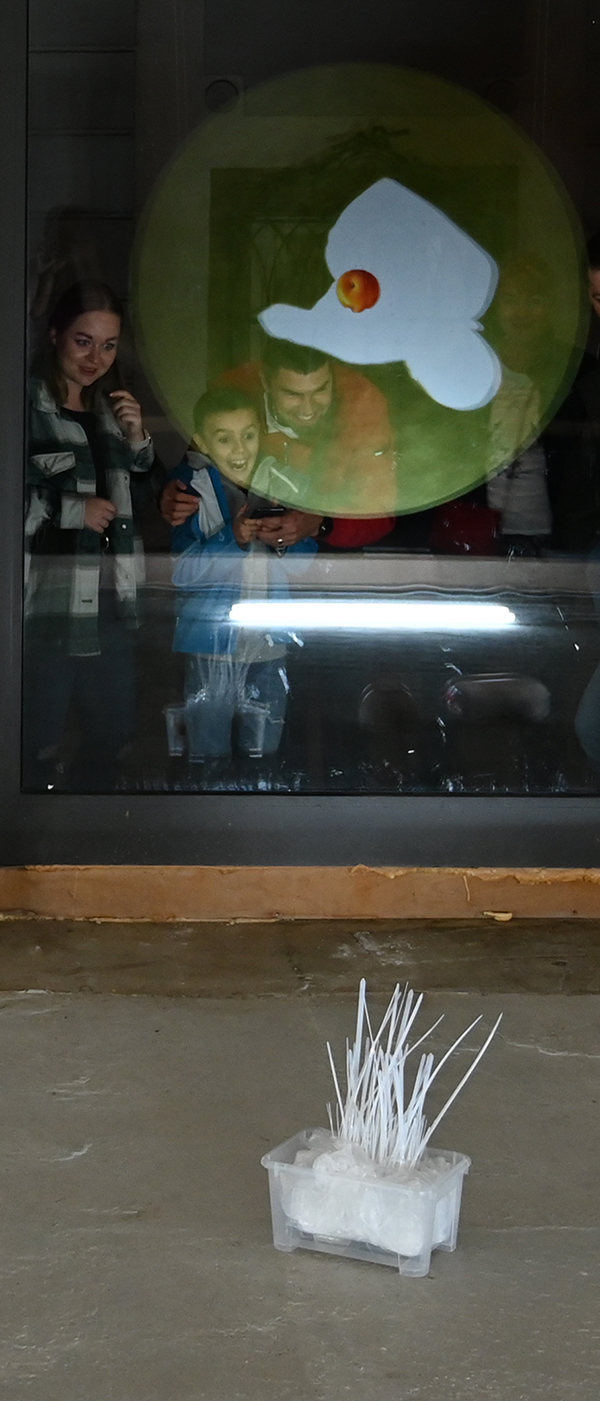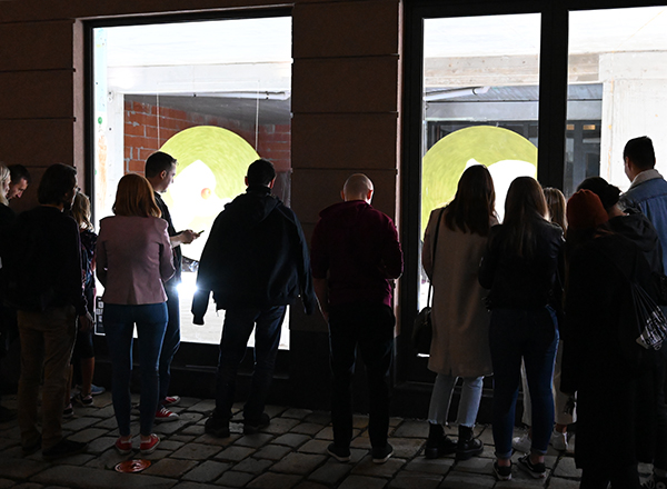Sadobot v stratenom raji, 2021, interaktívna inštalácia s 12 maľbami a 10 robotickými objektami Sadobot, Festival Biela noc, Edison Filmhub (výklad), Baštová 6, Bratislava, technická spolupráca: Jakub Pišek, foto: Dorota Sadovská