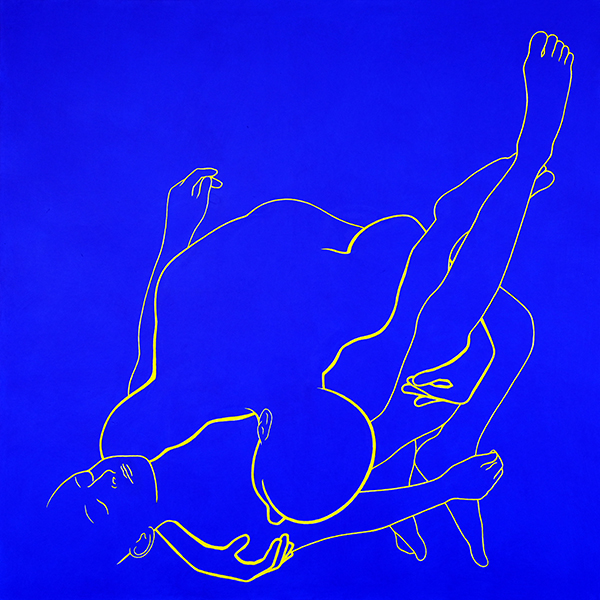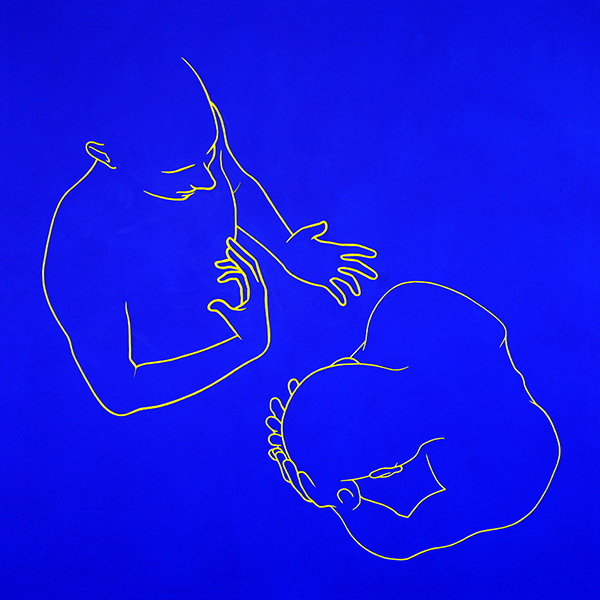 Mŕtvych pochovávať (Svätý Damián), zo série 7 skutkov telesného milosrdenstva, 2022, akryl na plátne 140 x 140 cm, na výstave 7 hlavných hriechov / 7 cností, Galéria Slovenského rozhlasu, Bratislava, foto: Serafína Janošková
