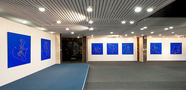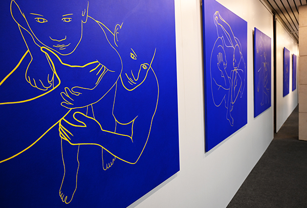 7 skutkov telesného milosrdenstva, 2022, akryl na plátne, každý obraz 140 x 140 cm, na výstave 7 hlavných hriechov / 7 cností, Galéria Slovenského rozhlasu, Bratislava, foto: Galéria Slovenského rozhlasu