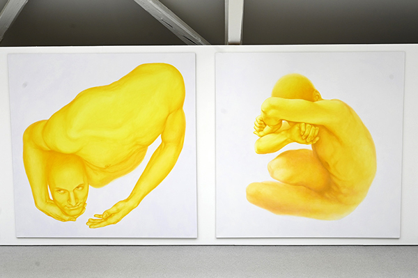 Gelber Weg (Der heilige Dionysos, 2016, Der heilige Stephanus, 2014), 2023, Installation der 14 Gemälde, jeder 190 x 190 cm, Künstlerhaus Bregenz